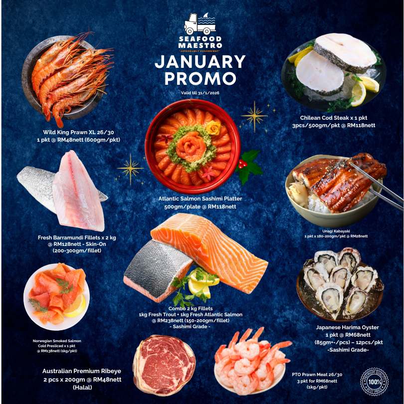 | List of Product | Australian Premium Ribeye (Halal) x 2 pcs (200gm) @ RM48nett, Chilean Cod Steak x 1 packet – 3pcs (500gm) @ RM118nett, Fresh Barramundi Fillets x 2kg Skin-On (200-300gm/fillet) @ RM128nett, Japanese Harima Oyster x 1 packet – Sashimi Grade (12 pcs, 85gm each) @ RM68nett, Norwegian Smoked Salmon (Cold Presliced) 1 pkt (1kg) @ RM138nett – Latitude Brand, PTO Prawn Meat 26/30 x 3 packets (1kg each) @ RM68nett, Royal Smoked Duck (Halal) x 2 packets (200-360gm) @ RM38nett, Salmon Combo Fillets (Sashimi Grade): 1kg Fresh Trout + 1kg Fresh Atlantic Salmon @ RM238nett (150–200gm per fillet), Salmon Sashimi Platter – 500g @ RM118 nett – Comes with FREE Wasabi, Shoyu, Ginger & Bamboo Chopsticks, Unagi Kabayaki x 1 packet (180-200gm) @ RM28nett, Wild King Prawn XL 26/30 1 pkt (600gm) @ RM48nett |